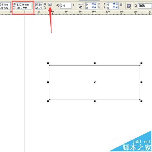 1、在电脑上打开CorelDRAW软件,选择”矩形工具“,画一个长方形,打开长宽锁定按键,解除锁定,再设置长方形的长为130mm,高为50mm。
