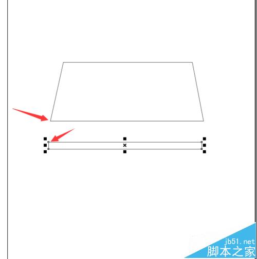 6、选择”挑选工具“,再选择小长方形,把鼠标放在小长形的左上角的位置,直到鼠标显示为四个箭头时,就按着鼠标左键,将小长形拖到梯形的左下角。将小长方形拖到梯形的左下角位置的时候,梯形的左下角就会像磁铁一样吸住小长方形的。