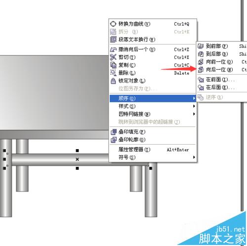 21、用鼠标右击这个横着的桌脚,在弹出来的菜单上选择“顺序”,再选择“向后一位”。