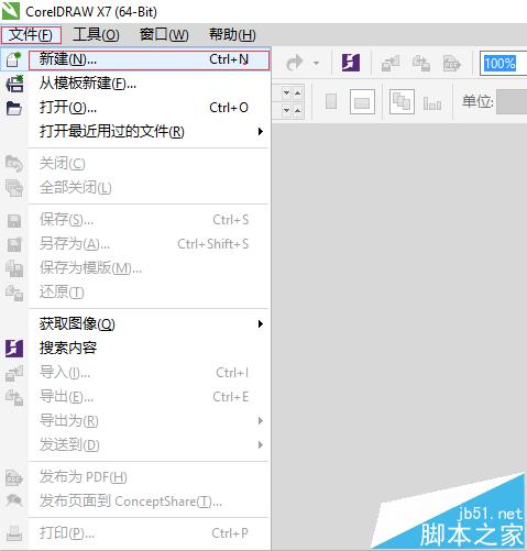 1、打开CorelDRAW x7,在菜单栏中选择点击“文件”菜单,弹出文件菜单栏选择点击“新建”(快捷键Ctrl+N)如图;