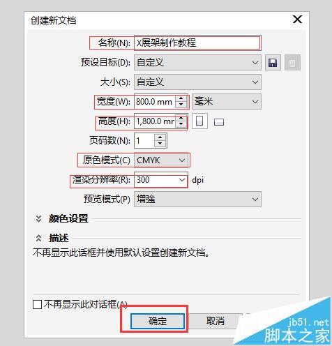2、在弹出的“创建新文档”窗口内设置文件名称,宽度:800mm,高度:1800mm(X展架常用的尺寸:600mm*1600mm或800mm*1800mm),色彩模式:CMYK, 分辨率:300dpi,选择点击一下“确认”,如图;