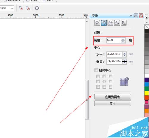 18、如图所示,我们已经为花瓣的旋转填一个合适的旋转角度,以便让花瓣以花蕊为中心旋转复制,这里我们填写为60度旋转,之后我们点击箭头所指的的“应用到在制”按钮,并连续按按5下。
