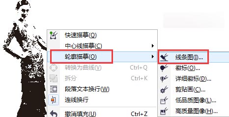 步骤二 从菜单栏,执行“位图”→“轮廓描摹”→“线条图”命令,或选中位图图片,鼠标右键,在弹出的快捷菜单中选择“轮廓描摹”→“线条图”。