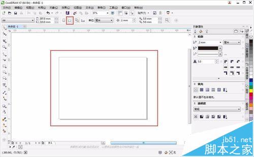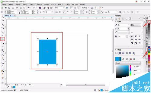 4、然后在A4操作区中,选择左侧的工具栏中的“矩形工具”,在操作区中画出一个方形形状,然后在右侧的“默认 调色板”中,点击蓝色。把方块图案填充为蓝色。接着点击上方的“去边框颜色”,把矩形的边框黑色颜色去掉。