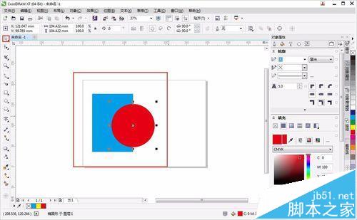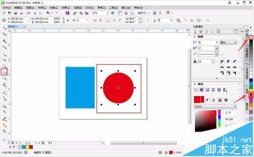 5、同样在A4操作区中,选择左侧的工具栏中的“椭圆形工具”,在操作区中画出一个圆形形状(同时按住CTRL+SHIFT键,用鼠标画出正园),然后在右侧的“默认 调色板”中,点击红色。把圆行图案填充为红色。接着点击上方的“去边框颜色”,把矩形的边框黑色颜色去掉。
