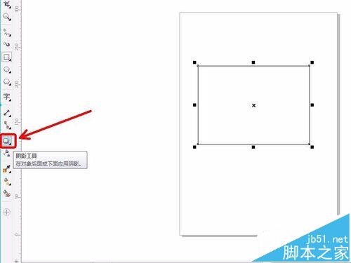 2、选择左侧工具栏矩形工具,在画布中画一个矩形框。然后点击阴影工具,选择阴影的起始位置,如矩形右边。然后拖动鼠标向某一方向建立阴影。