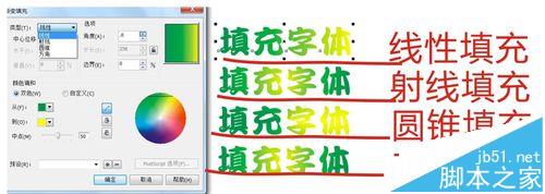 (2)点击填充工具中的“渐变填充”,就会弹出 “渐变填充”对话框。其中“类型”、“选项”、“颜色调和”这三个属性是决定渐变效果的关键。