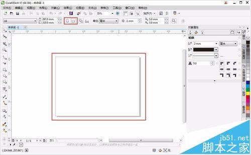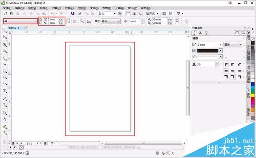 3、默认的工作区是A4大小,现在在我们coreldraw桌面上就可以看到一个方框,这个方框的默认大小就是A4大小。上面属性栏我们可以选择操作区的大小与尺寸。