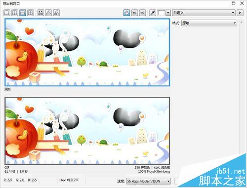 3、在“格式”下拉列表中选择一种图像输出格式,自定义导出设置,如颜色、显示选项和大小等,观察优化后图像的大小和下载所需时间。优化网络图像满意后,单击“另存为”按钮,即导出优化的网络图像。
