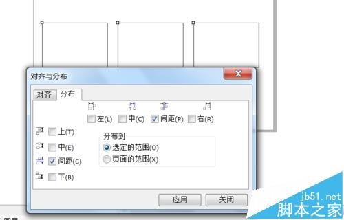 “分布”:和“对齐”一样,横向和纵向要选择的对象不一样,同样可以通过“应用”按钮提前预览效果。一般是选择“间距”,意思是使排列的对象按同等距离进行排列。