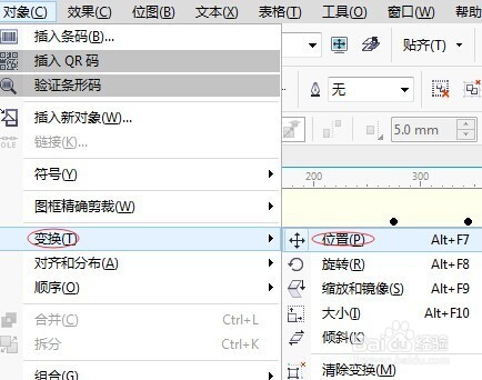 2、点击对象→变换→位置,打开“变换”泊坞窗。