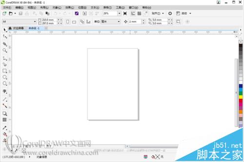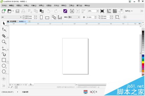 1、CorelDRAW默认安装初始界面按钮图标是以最小状态显示,如图所示。对于大屏幕的电脑来说,界面图标(包括界面上方属性栏、工具栏,左侧工具箱及右侧调色板)都比较小,操作起来会有不便。