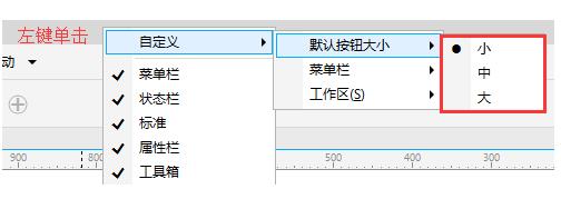 2、除此之外,各工作界面的按钮大小也可以单独定义,比如,先在命令栏下方选择要改变按钮大小的相关工具栏或菜单栏(必须要选中字并呈现灰色显示状态才可操作),如图所示,这里选择工具箱,按钮大小以“小”状态显示,此时的界面只有工具箱按钮变小,其他按钮不变,而且这个操作是即时显示的即点击之后就可预览效果。