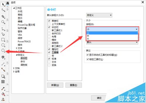 2、单击菜单栏“窗口>工具栏>默认按钮大小”,在弹出的菜单对话框中,定义按钮大小。另外,还可以鼠标右键单击菜单栏、工具箱、属性栏中的任意一栏目,依次点击“自定义>默认按钮大小”根据需要选择即可。如下图所示。
