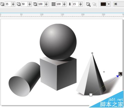 14、阴影制作 做其他几何静物的阴影,用“选择工具”框选六角棱锥所有组成面,按Ctrl+G组合对象,然后使用“阴影工具”应用阴影效果,需要注意的是这个阴影是有深到浅的变化的,我们需要调整“阴影淡出”和“阴影的不透明度”的设置。