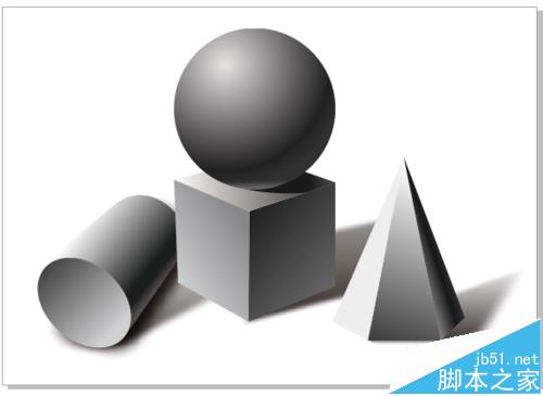 6、填充颜色 先做一个颜色填充的示范,你也可以把所有的几何图形摆列好位置,再填充。选择工具箱中的“交互式填充工具”给正方体的其中一个面黑到灰的线性渐变填充,其他面做法类似。需要注意的是,素描中的明暗区域要表现到位,即有亮面、灰面和暗面的对比。