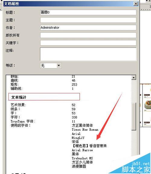 3、打开文档属性后,我们下拉到——文本统计的地方,看到我们册里子还有很多种字体。