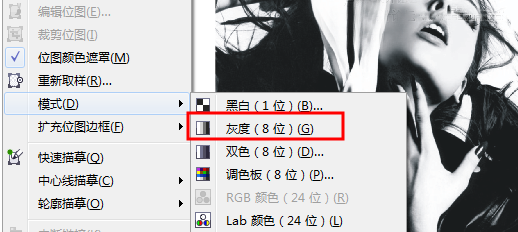 4. 设置灰色 执行“位图”>“模式”>“灰度”菜单命令,如图所示,将图片设置为灰色。