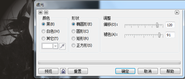 5. 设置暗角 选择位图,执行“位图”>“创造性”>“虚光”命令。打开“虚光”对话框,设置“颜色”为黑色,“形状”设置为椭圆形,调整偏移和褪色参数,单击“预览”按钮,单击“确定”按钮,位图即可应用滤镜。效果如图所示。