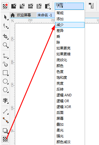 4. 选择工具箱中的“透明度工具”,在其工具栏属性的“合并模式”中单击右侧黑色三角号选择“减少”选项。