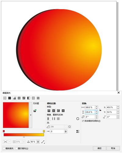步骤二、复制并填充图形 用同样的方法在复制出一个正圆,并重新填充颜色,按“F11”键打开选择“渐变填充”的“编辑填充”对话框,在弹出的对话框中设置颜色参数,填充效果如图所示。