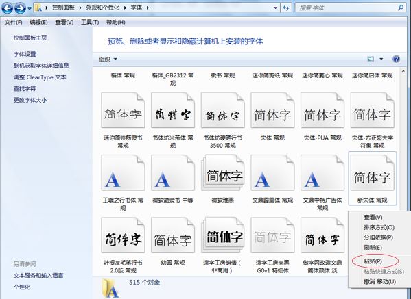 方法二:依次打开,我的电脑→C盘→“Windows”文件夹→“Fonts”字体文件夹后,选中从网上下载的字体,鼠标右键—复制,在“Fonts”文件夹中的空白处单击鼠标右键—粘贴。