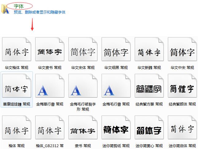 步骤三:接着找到“字体”双击打开,当打开字体面板的时候,我们就会看到里面有很多系统自带的或者我们以前安装过的字体,这里就是存储安装的字体的位置。如图: