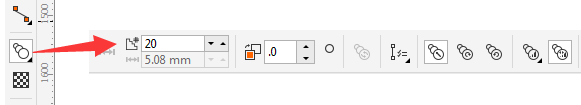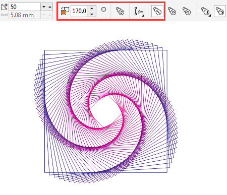 在属性栏中,调整其步数为50,设置调和旋转角度为170度,选择直接调和,设置好这些属性之后,呈现效果如图所。