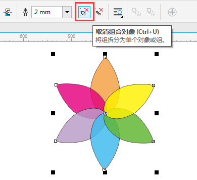 1. 取消编组也是在选择工具属性栏中以按钮形式显示,它的快捷键是Ctrl+U,如下图所示。
