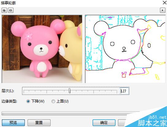 边缘检测:“边缘检测”滤镜可以查找位图图像中的边缘并勾画出对象轮廓,此滤镜适合高对比的位图图像的轮廓查找。