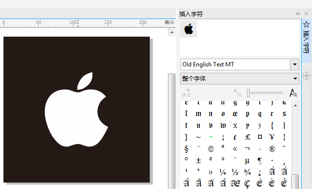 5. 找到想要的字符,双击可以显示在页面中心位置,或者您也可以拖拽到页面任意位置,如下图所示,就是利用“插入字符”绘制的苹果Logo。