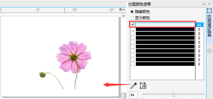 3. 选择位图,执行“位图>位图颜色遮罩”命令,在界面右侧弹出的“位图颜色遮罩”泊坞窗中选“隐藏颜色”即将选定的颜色隐藏,在颜色列表中选择第一个颜色条,将其勾选。