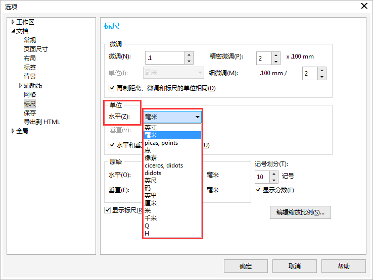 2. 在“单位”区域内,从“水平”列表框中选择一种测量单位。如果希望对垂直标尺使用不同的测量单位,不勾选“水平和垂直标尺使用相同的单位”复选框。然后在垂直列表框中选择一种测量单位。