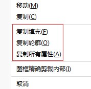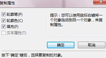 用鼠标右击按住一个对象不放,将对象拖动到另一个对象上,释放鼠标后,在弹出的菜单中选择“复制填充”、“复制轮廓”或“复制所有属性”,即可将选择对象中的填充、轮廓线或所有属性复制到另一个对象上。