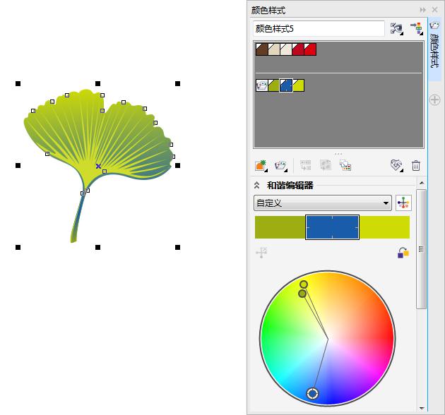 3. 在“和谐”组中分别单击其中的子颜色样式,在颜色编辑器或和谐编辑器中编辑该样式的颜色。在编辑和谐组中的某一个子颜色样式时,和谐组中其他的子颜色不会受到影响。