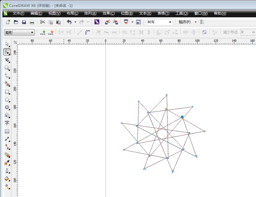 4、点击图纸上绘制的星形节点,随意拖动,我们将获得一个新的星形图形。将星形拖动至最外即可获得多边形,因此星形是放在多边形工具箱中的。