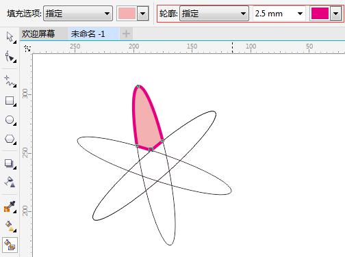 3. 从“轮廓选项”下拉列表中选择“指定”,选择右侧的轮廓宽度,并单击右侧的“轮廓色”色样,选择一种颜色,在想要对象填充的区域单击,即可填充该区域轮廓属性了。