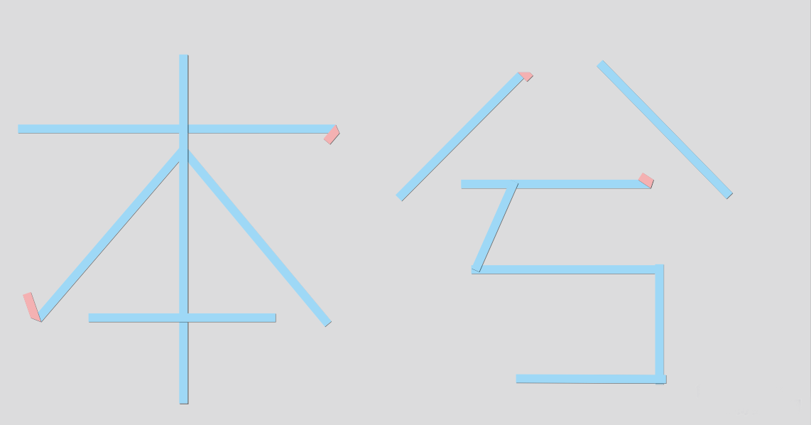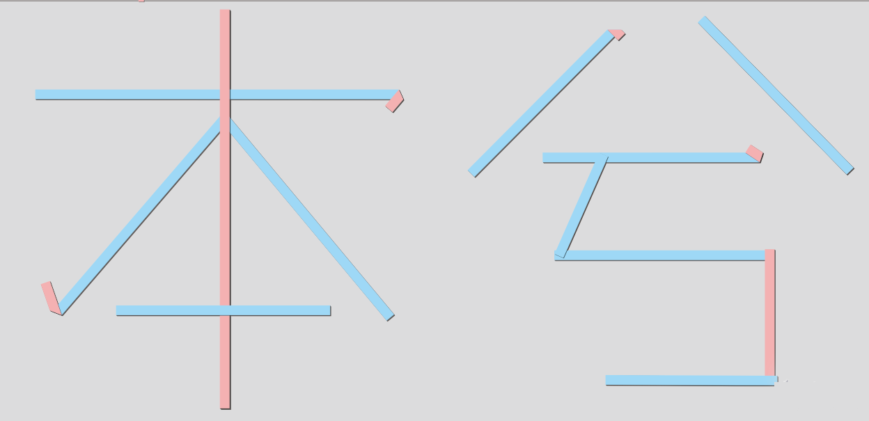添加阴影以后,我们还需要调节笔画的叠放次序,我这里是让笔画上下错开的,比如本字的竖,他是放在第一横和撇、捺的上面的,然后最后的横就放在竖的上面。