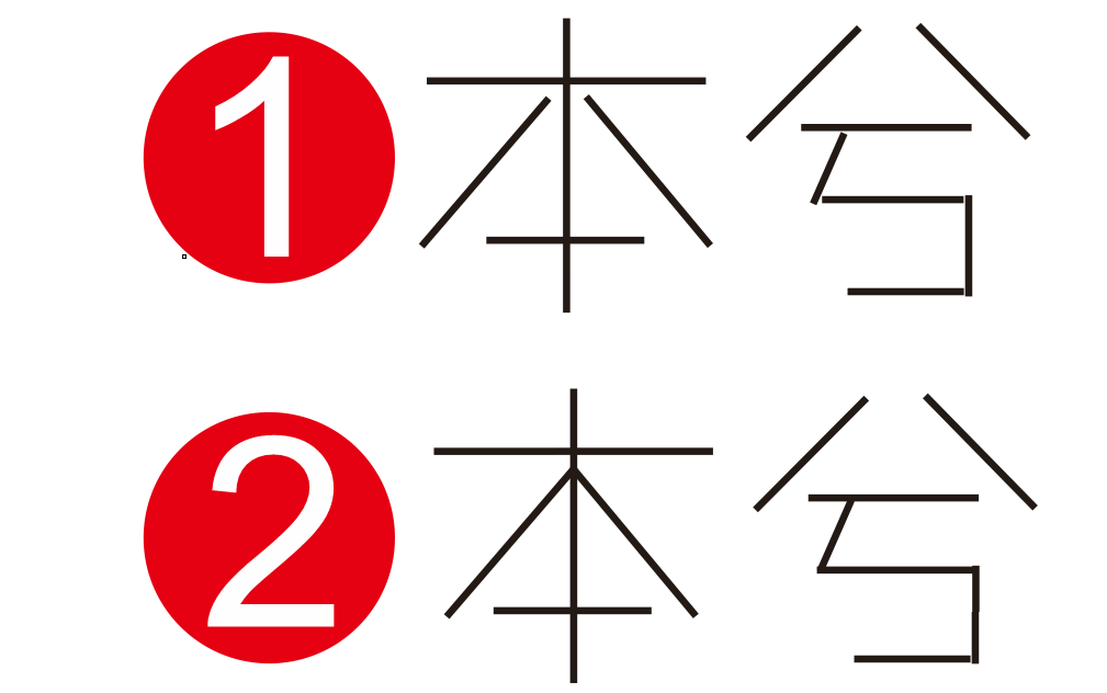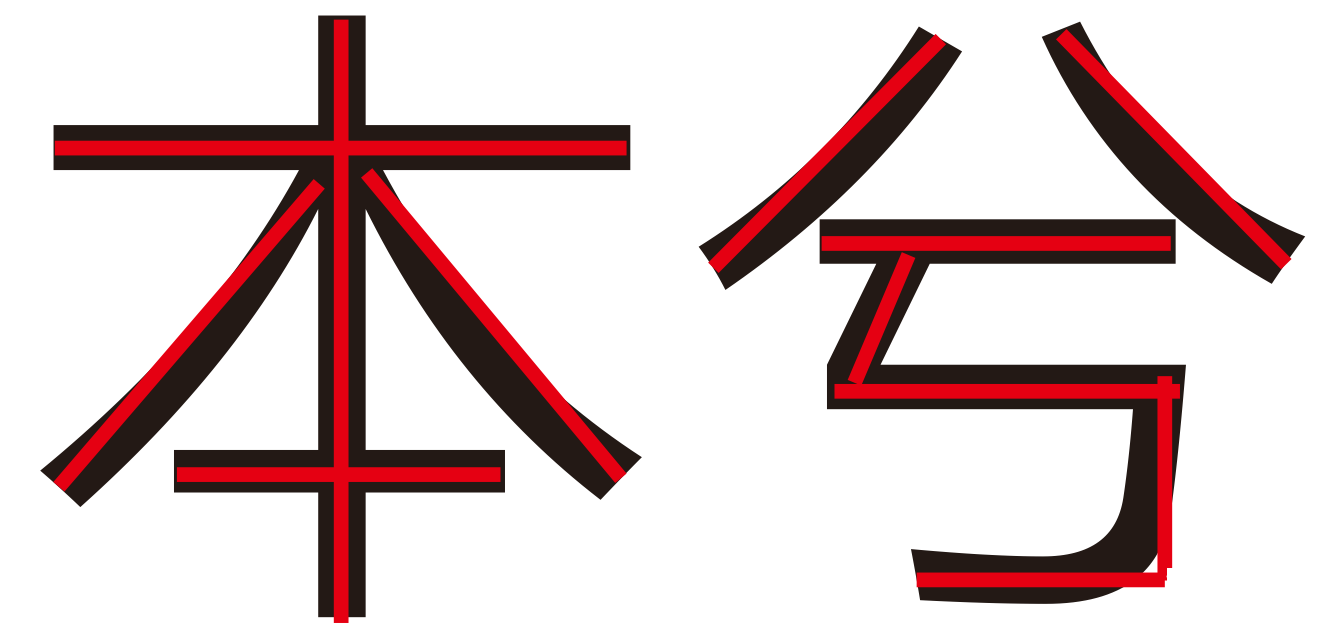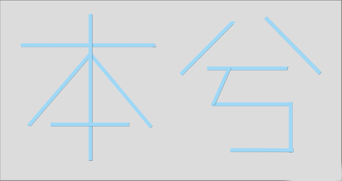 这就是最终的效果了,不过我为什么翻过来的是这2个笔画呢,那是因为本的竖这一笔连接着其他是所有笔画,如果把竖翻过来则贯穿了整个本字,蓝色和红色的对比效果我个人觉得是最好的,而折边的地方也不是随意的,本兮二字的折边都是按照:一左一右,一上一下的规则进行选择的结果,因为这样的对比是最好的!