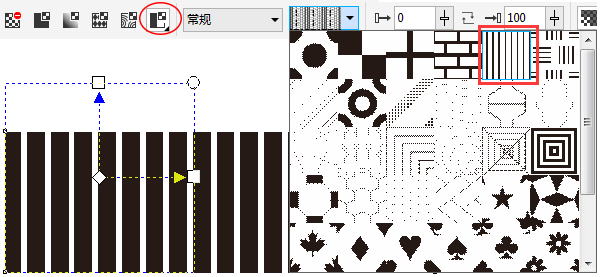 步骤2:在工具箱中单击“透明度工具”,在属性栏中选择“双色图样透明度”,图样选择条纹图样,如图所示。
