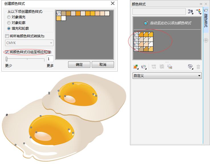 7. 将选择的对象拖到“颜色样式”泊坞窗的和谐组框内,在弹出的“创建颜色样式”对话框中选择“将颜色样式归组至相应和谐”复选框,单击“确定”按钮,即可利用选择对象的填充颜色和轮廓颜色创建颜色样式,新建的和谐组颜色样式显示在“颜色样式”泊坞窗中。