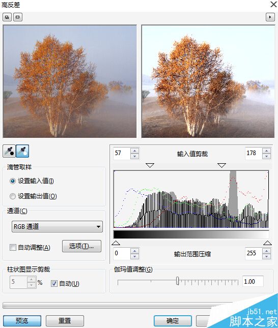 输出范围压缩:在色阶示意图下面的“输出范围压缩”选项适用于指定图像最亮色调和最暗色调的标准值,拖动相应三角滑块可调整对应色调效果。
