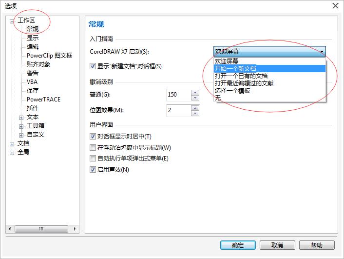 或者,启动CorelDRAW后,点击“工具”>“选项”,弹出选项框。在“工作区”>“常规”下面将“CorelDRAW启动”模式的“欢迎屏幕”改为自己喜欢的打开方式(为了方便工作,一般会选择“开始一个新文档”)。
