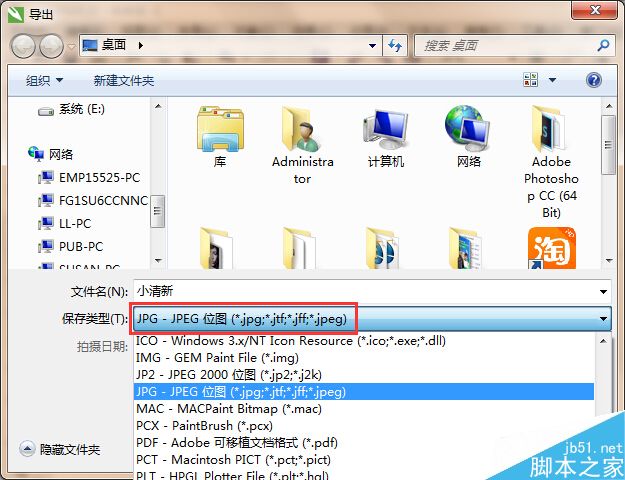 2、当我们选择文件保存的时候,你会发现没有保存为jpg格式的文件。我们需要用“导出”来完成,单击“文件→导出”命令,在弹出的对话框中输入文件名并选择保存类型为jpg模式。