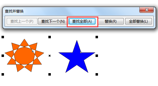 5. 点击“完成”按钮之后,弹出“查找并替换”窗口,然后单击“查找全部”命令,则绘图页面中得所有RGB颜色图形被选中(此步骤可省略),如图。