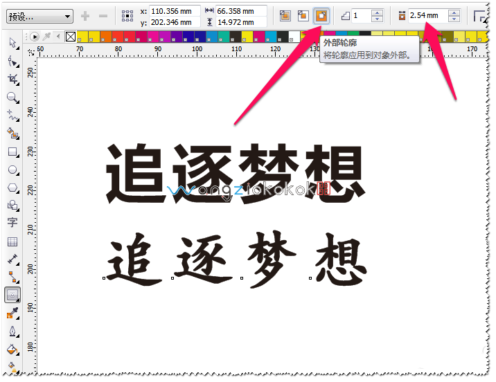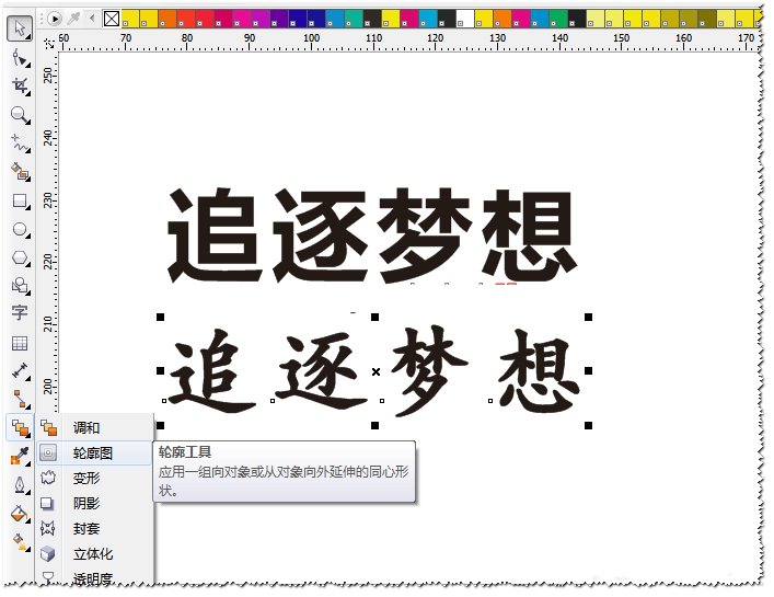 2、选中你想要加粗的文字,进行外轮廓。可以选轮廓的层数及轮廓大小,颜色等。如图