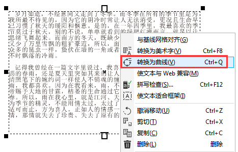 2. 鼠标右键单击在弹出的快捷列表中选择“转换为曲线”命令(快捷键Ctrl+Q)即可将段落文字转曲。