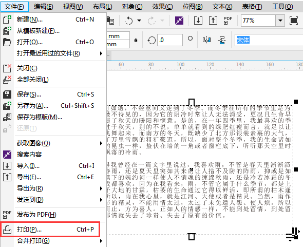 1. 使用F8“文本工具”,拖动鼠标实现段落文本框,在框内单击添加段落文字,选取段落文字,执行“文件>打印”命令,快捷键Ctrl+p。
