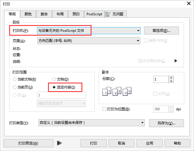 2. 在弹出“打印”对话框中,设置名称为“与设备无关的POSTScript文件”、打印范围选择“选定内容”,然后单击“打印”。