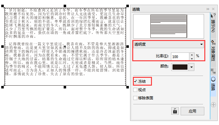 2. 菜单栏执行“效果>透镜”命令(快捷键Alt+F3),在界面右侧弹出“透镜”面板中,选择滤镜效果中的“透明度”,设置“比率”为100%,即完全透明,勾选下方“冻结”选项,设置完毕,点击“应用”。